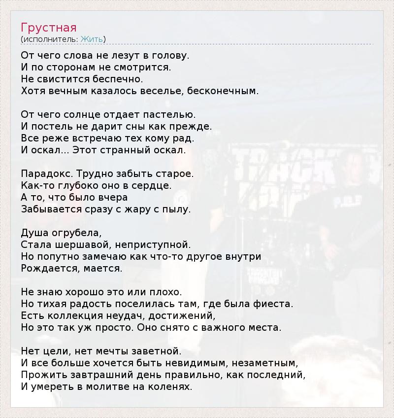 От чего слова не лезут в голову. И по сторонам не смотрится. Не свистится беспечно. Хотя вечным казалось веселье, бесконечным. От чего солнце отдает пастелью. И постель не дарит сны как прежде. Все реже встречаю тех кому рад. И оскал... Этот странный оскал. Парадокс. Трудно забыть старое. Как-то глубоко оно в сердце. А то, что было вчера Забывается сразу с жару с пылу. Душа огрубела, Стала шершавой, неприступной. Но попутно замечаю как что-то другое внутри Рождается, мается. Не знаю хорошо это или плохо. Но тихая радость поселилась там, где была фиеста. Есть коллекция неудач, достижений, Но это так уж просто. Оно снято с важного места. Нет цели, нет мечты заветной. И все больше хочется быть невидимым, незаметным, Прожить завтрашний день правильно, как последний, И умереть в молитве на коленях.