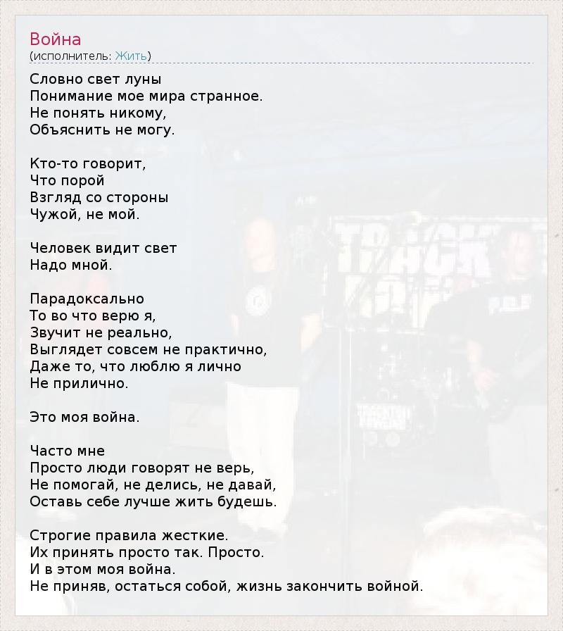 Словно свет луны Понимание мое мира странное. Не понять никому, Объяснить не могу. Кто-то говорит, Что порой Взгляд со стороны Чужой, не мой. Человек видит свет Надо мной. Парадоксально То во что верю я, Звучит не реально, Выглядет совсем не практично, Даже то, что люблю я лично Не прилично. Это моя война. Часто мне Просто люди говорят не верь, Не помогай, не делись, не давай, Оставь себе лучше жить будешь. Строгие правила жесткие. Их принять просто так. Просто. И в этом моя война. Не приняв, остаться собой, жизнь закончить войной.