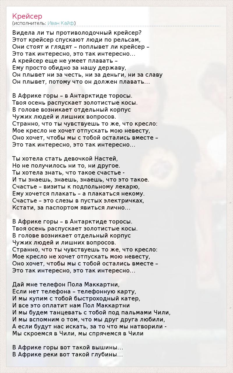 Это интересно:Потому что там, где нет войныНи ты ни я - мы не нужны…"Ты хочешь знать?", Иван-КайфВ качестве "информации к размышлению" мы предлагаем Вам прочитать историю группы, написанную частично по материалам прессы, частично по рассказам бессменного лидера группы - Михаила Зуева и ее гитариста - Евгения Панина, частично по собственным наблюдениям.Последнее обновление... продолжение