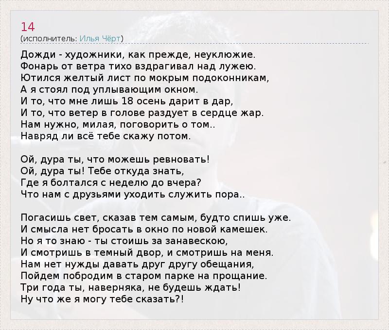 Дожди - художники, как прежде, неуклюжие. Фонарь от ветра тихо вздрагивал над лужею. Ютился желтый лист по мокрым подоконникам, А я стоял под уплывающим окном. И то, что мне лишь 18 осень дарит в дар, И то, что ветер в голове раздует в сердце жар. Нам нужно, милая, поговорить о том.. Навряд ли всё тебе скажу потом. Ой, дура ты, что можешь ревновать! Ой, дура ты! Тебе откуда знать, Где я болтался с неделю до вчера? Что нам с друзьями уходить служить пора.. Погасишь свет, сказав тем самым, будто спишь уже. И смысла нет бросать в окно по новой камешек. Но я то знаю - ты стоишь за занавескою, И смотришь в темный двор, и смотришь на меня. Нам нет нужды давать друг другу обещания, Пойдем побродим в старом парке на прощание. Три года ты, наверняка, не будешь ждать! Ну что же я могу тебе сказать?!