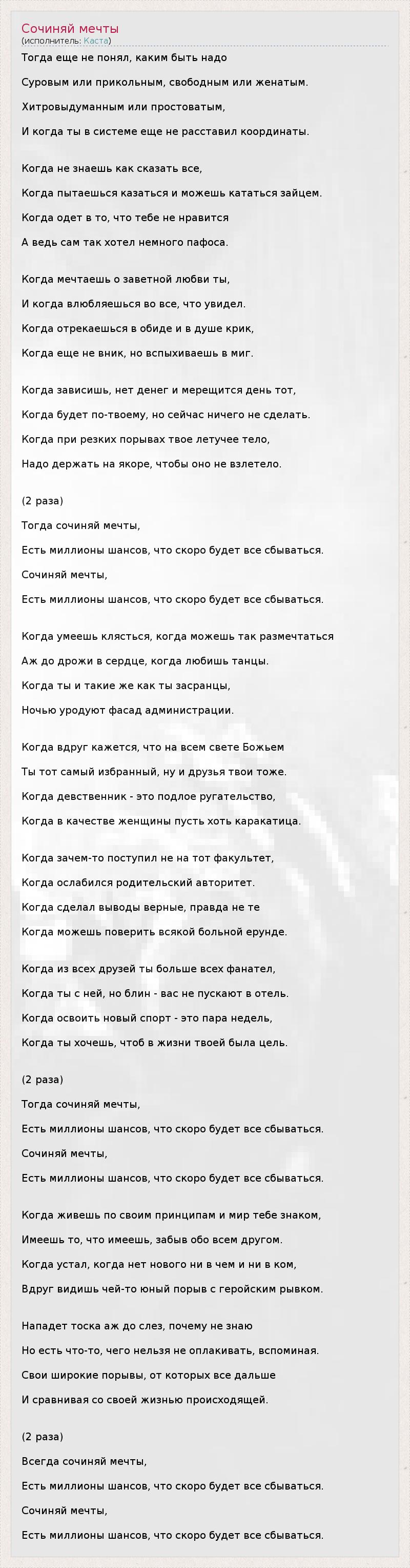 Тогда еще не понял, каким быть надо Суровым или прикольным, свободным или женатым. Хитровыдуманным или простоватым, И когда ты в системе еще не расставил координаты. Когда не знаешь как сказать все, Когда пытаешься казаться и можешь кататься зайцем. Когда одет в то, что тебе не нравится А ведь сам так хотел немного пафоса. Когда мечтаешь о заветной любви ты, И когда влюбляешься во все, что увидел. Когда отрекаешься в обиде и в душе крик, Когда еще не вник, но вспыхиваешь в миг. Когда зависишь, нет денег и мерещится день тот, Когда будет по-твоему, но сейчас ничего не сделать. Когда при резких порывах твое летучее тело, Надо держать на якоре, чтобы оно не взлетело. (2 раза) Тогда сочиняй мечты, Есть миллионы шансов, что скоро будет все сбываться. Сочиняй мечты, Есть миллионы шансов, что скоро будет все сбываться. Когда умеешь клясться, когда можешь так размечтаться Аж до дрожи в сердце, когда любишь танцы. Когда ты и такие же как ты засранцы, Ночью уродуют фасад администрации. Когда вдруг кажется, что на всем свете Божьем Ты тот самый избранный, ну и друзья твои тоже. Когда девственник - это подлое ругательство, Когда в качестве женщины пусть хоть каракатица. Когда зачем-то поступил не на тот факультет, Когда ослабился родительский авторитет. Когда сделал выводы верные, правда не те Когда можешь поверить всякой больной ерунде. Когда из всех друзей ты больше всех фанател, Когда ты с ней, но блин - вас не пускают в отель. Когда освоить новый спорт - это пара недель, Когда ты хочешь, чтоб в жизни твоей была цель. (2 раза) Тогда сочиняй мечты, Есть миллионы шансов, что скоро будет все сбываться. Сочиняй мечты, Есть миллионы шансов, что скоро будет все сбываться. Когда живешь по своим принципам и мир тебе знаком, Имеешь то, что имеешь, забыв обо всем другом. Когда устал, когда нет нового ни в чем и ни в ком, Вдруг видишь чей-то юный порыв с геройским рывком. Нападет тоска аж до слез, почему не знаю Но есть что-то, чего нельзя не оплакивать, вспоминая. Свои широкие порывы, от которых все дальше И сравнивая со своей жизнью происходящей. (2 раза) Всегда сочиняй мечты, Есть миллионы шансов, что скоро будет все сбываться. Сочиняй мечты, Есть миллионы шансов, что скоро будет все сбываться.