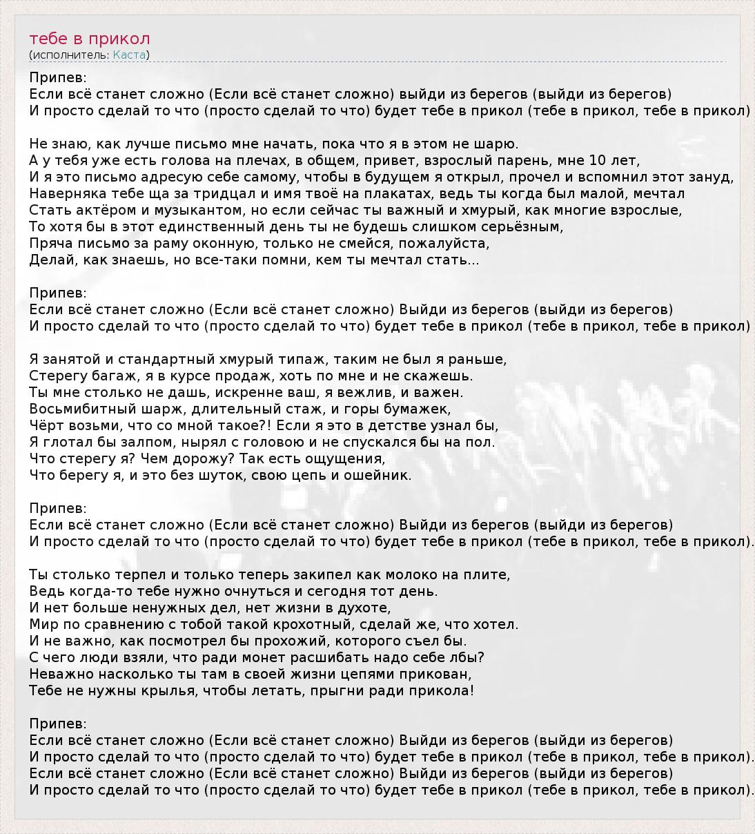 Припев: Если всё станет сложно (Если всё станет сложно) выйди из берегов (выйди из берегов) И просто сделай то что (просто сделай то что) будет тебе в прикол (тебе в прикол, тебе в прикол) Не знаю, как лучше письмо мне начать, пока что я в этом не шарю. А у тебя уже есть голова на плечах, в общем, привет, взрослый парень, мне 10 лет, И я это письмо адресую себе самому, чтобы в будущем я открыл, прочел и вспомнил этот зануд, Наверняка тебе ща за тридцал и имя твоё на плакатах, ведь ты когда был малой, мечтал Стать актёром и музыкантом, но если сейчас ты важный и хмурый, как многие взрослые, То хотя бы в этот единственный день ты не будешь слишком серьёзным, Пряча письмо за раму оконную, только не смейся, пожалуйста, Делай, как знаешь, но все-таки помни, кем ты мечтал стать... Припев: Если всё станет сложно (Если всё станет сложно) Выйди из берегов (выйди из берегов) И просто сделай то что (просто сделай то что) будет тебе в прикол (тебе в прикол, тебе в прикол) Я занятой и стандартный хмурый типаж, таким не был я раньше, Стерегу багаж, я в курсе продаж, хоть по мне и не скажешь. Ты мне столько не дашь, искренне ваш, я вежлив, и важен. Восьмибитный шарж, длительный стаж, и горы бумажек, Чёрт возьми, что со мной такое?! Если я это в детстве узнал бы, Я глотал бы залпом, нырял с головою и не спускался бы на пол. Что стерегу я? Чем дорожу? Так есть ощущения, Что берегу я, и это без шуток, свою цепь и ошейник. Припев: Если всё станет сложно (Если всё станет сложно) Выйди из берегов (выйди из берегов) И просто сделай то что (просто сделай то что) будет тебе в прикол (тебе в прикол, тебе в прикол). Ты столько терпел и только теперь закипел как молоко на плите, Ведь когда-то тебе нужно очнуться и сегодня тот день. И нет больше ненужных дел, нет жизни в духоте, Мир по сравнению с тобой такой крохотный, сделай же, что хотел. И не важно, как посмотрел бы прохожий, которого съел бы. С чего люди взяли, что ради монет расшибать надо себе лбы? Неважно насколько ты там в своей жизни цепями прикован, Тебе не нужны крылья, чтобы летать, прыгни ради прикола! Припев: Если всё станет сложно (Если всё станет сложно) Выйди из берегов (выйди из берегов) И просто сделай то что (просто сделай то что) будет тебе в прикол (тебе в прикол, тебе в прикол). Если всё станет сложно (Если всё станет сложно) Выйди из берегов (выйди из берегов) И просто сделай то что (просто сделай то что) будет тебе в прикол (тебе в прикол, тебе в прикол).