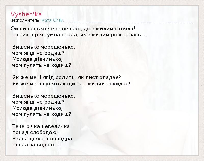 Ой вишенько-черешенько, де з милим стояла! І з тих пір я сумна стала, як з милим розсталась... Вишенько-черешенько, чом ягід не родиш? Молода дівчинько, чом гулять не ходиш? Як же мені ягід родить, як лист опадає? Як же мені гулять ходить, - милий покидає! Вишенько-черешенько, чом ягід не родиш? Молода дівчинько, чом гулять не ходиш? Тече річка невеличка понад слободою... Взяла дівка нові відра пішла за водою...