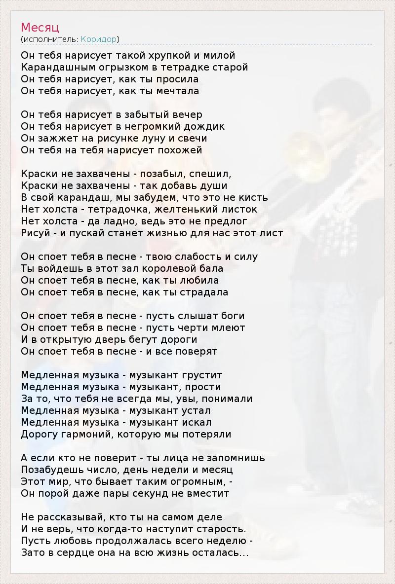Он тебя нарисует такой хрупкой и милой Карандашным огрызком в тетрадке старой Он тебя нарисует, как ты просила Он тебя нарисует, как ты мечтала Он тебя нарисует в забытый вечер Он тебя нарисует в негромкий дождик Он зажжет на рисунке луну и свечи Он тебя на тебя нарисует похожей Краски не захвачены - позабыл, спешил, Краски не захвачены - так добавь души В свой карандаш, мы забудем, что это не кисть Нет холста - тетрадочка, желтенький листок Нет холста - да ладно, ведь это не предлог Рисуй - и пускай станет жизнью для нас этот лист Он споет тебя в песне - твою слабость и силу Ты войдешь в этот зал королевой бала Он споет тебя в песне, как ты любила Он споет тебя в песне, как ты страдала Он споет тебя в песне - пусть слышат боги Он споет тебя в песне - пусть черти млеют И в открытую дверь бегут дороги Он споет тебя в песне - и все поверят Медленная музыка - музыкант грустит Медленная музыка - музыкант, прости За то, что тебя не всегда мы, увы, понимали Медленная музыка - музыкант устал Медленная музыка - музыкант искал Дорогу гармоний, которую мы потеряли А если кто не поверит - ты лица не запомнишь Позабудешь число, день недели и месяц Этот мир, что бывает таким огромным, - Он порой даже пары секунд не вместит Не рассказывай, кто ты на самом деле И не верь, что когда-то наступит старость. Пусть любовь продолжалась всего неделю - Зато в сердце она на всю жизнь осталась…