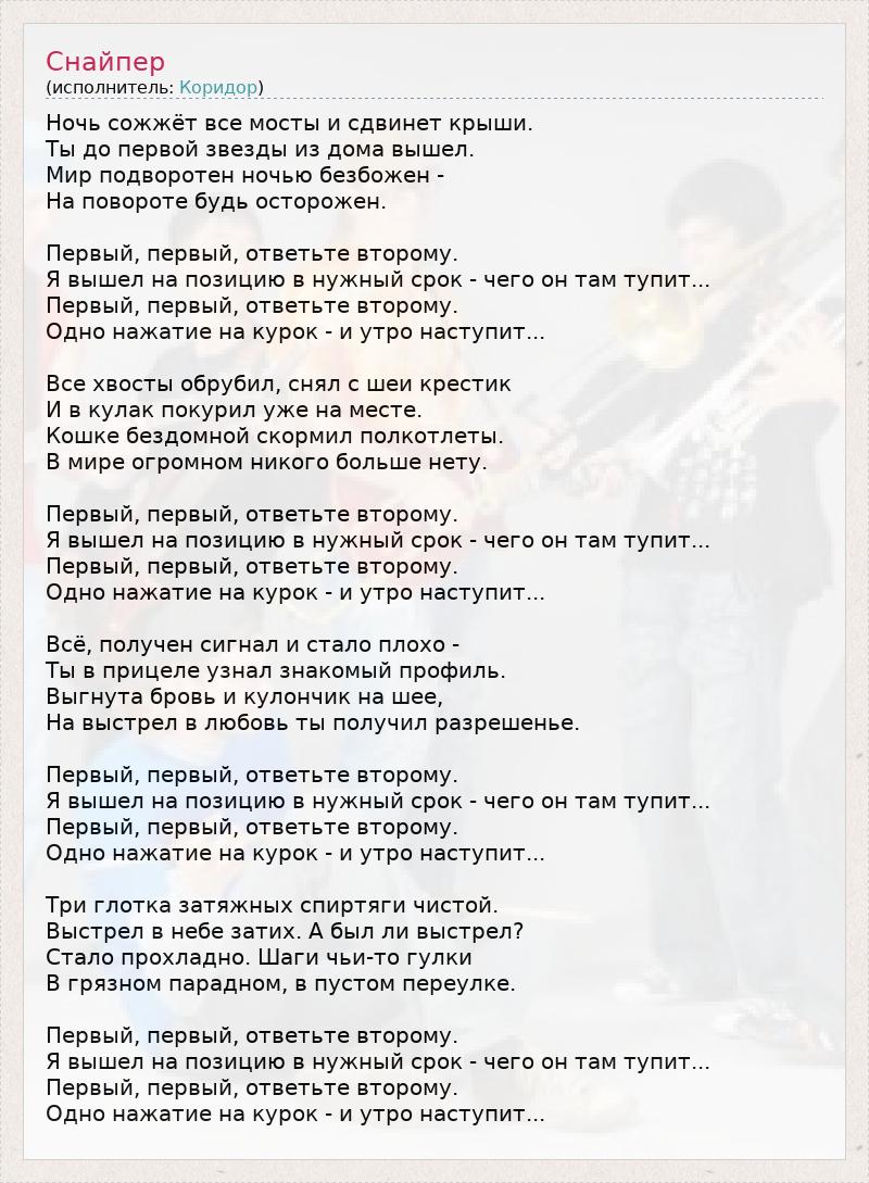 Ночь сожжёт все мосты и сдвинет крыши. Ты до первой звезды из дома вышел. Мир подворотен ночью безбожен - На повороте будь осторожен. Первый, первый, ответьте второму. Я вышел на позицию в нужный срок - чего он там тупит... Первый, первый, ответьте второму. Одно нажатие на курок - и утро наступит... Все хвосты обрубил, снял с шеи крестик И в кулак покурил уже на месте. Кошке бездомной скормил полкотлеты. В мире огромном никого больше нету. Первый, первый, ответьте второму. Я вышел на позицию в нужный срок - чего он там тупит... Первый, первый, ответьте второму. Одно нажатие на курок - и утро наступит... Всё, получен сигнал и стало плохо - Ты в прицеле узнал знакомый профиль. Выгнута бровь и кулончик на шее, На выстрел в любовь ты получил разрешенье. Первый, первый, ответьте второму. Я вышел на позицию в нужный срок - чего он там тупит... Первый, первый, ответьте второму. Одно нажатие на курок - и утро наступит... Три глотка затяжных спиртяги чистой. Выстрел в небе затих. А был ли выстрел? Стало прохладно. Шаги чьи-то гулки В грязном парадном, в пустом переулке. Первый, первый, ответьте второму. Я вышел на позицию в нужный срок - чего он там тупит... Первый, первый, ответьте второму. Одно нажатие на курок - и утро наступит...