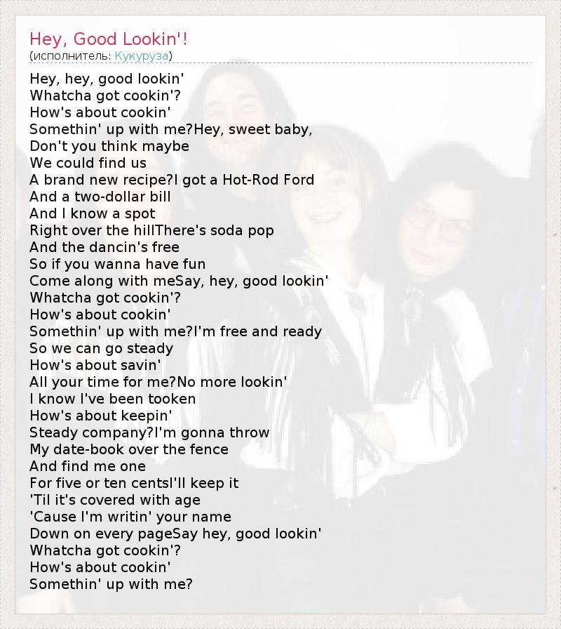Hey, hey, good lookin' Whatcha got cookin'? How's about cookin' Somethin' up with me?Hey, sweet baby, Don't you think maybe We could find us A brand new recipe?I got a Hot-Rod Ford And a two-dollar bill And I know a spot Right over the hillThere's soda pop And the dancin's free So if you wanna have fun Come along with meSay, hey, good lookin' Whatcha got cookin'? How's about cookin' Somethin' up with me?I'm free and ready So we can go steady How's about savin' All your time for me?No more lookin' I know I've been tooken How's about keepin' Steady company?I'm gonna throw My date-book over the fence And find me one For five or ten centsI'll keep it 'Til it's covered with age 'Cause I'm writin' your name Down on every pageSay hey, good lookin' Whatcha got cookin'? How's about cookin' Somethin' up with me?