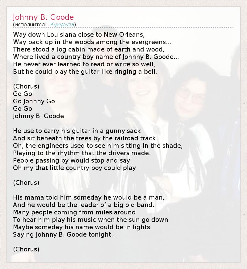 Way down Louisiana close to New Orleans, Way back up in the woods among the evergreens... There stood a log cabin made of earth and wood, Where lived a country boy name of Johnny B. Goode... He never ever learned to read or write so well, But he could play the guitar like ringing a bell. (Chorus) Go Go Go Johnny Go Go Go Johnny B. Goode He use to carry his guitar in a gunny sack And sit beneath the trees by the railroad track. Oh, the engineers used to see him sitting in the shade, Playing to the rhythm that the drivers made. People passing by would stop and say Oh my that little country boy could play (Chorus) His mama told him someday he would be a man, And he would be the leader of a big old band. Many people coming from miles around To hear him play his music when the sun go down Maybe someday his name would be in lights Saying Johnny B. Goode tonight. (Chorus)