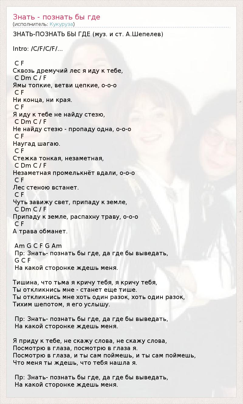 KNOW - HOW WOULD KNOW ( muses. , And Art. A.Shepelev ) Intro: / C / F / C / F / ... C F Through the dense forest , I 'm coming for you , C Dm C / F Muddy pit , branches tenacious , oh -oh C F No end or edge. C F I go to you can not find the path , C Dm C / F I can not find the path - one damn , oh -oh C F Random step. C F Stitch a thin , invisible , C Dm C / F Unobtrusive will fly away , oh -oh C F Wood wall will fall . C F Slightly zavizhu light crouching , Since Dm C / F Dropping to the ground , raspahnu grass, oh-oh -oh C F A cheat grass . Am G C F G Am Prospect : Znat- would know where , but where would find out , G C F At what sidelines waiting for me . The silence , the darkness I cry for you, I cry you You will respond to me - would be even quieter . You will respond me one once, though one once, Whisper quiet , I hear it . Prospect : Znat- would know where , but where would find out , At what sidelines waiting for me . I will come to you, do not say a word , I will not say a word , Look into my eyes , look into the eyes of me. Look into my eyes , and you yourself understand , and you yourself will understand What are you waiting for me that I found you . Prospect : Znat- would know where , but where would find out , Question: In what sidelines waiting for me .