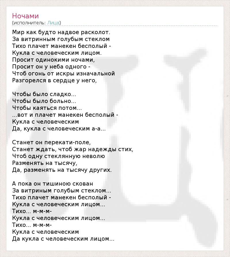 Мир как будто надвое расколот. За витринным голубым стеклом Тихо плачет манекен бесполый - Кукла с человеческим лицом. Просит одинокими ночами, Просит он у неба одного - Чтоб огонь от искры изначальной Разгорелся в сердце у него, Чтобы было сладко... Чтобы было больно... Чтобы каяться потом... ...вот и плачет манекен бесполый - Кукла с человеческим Да, кукла с человеческим а-а... Станет он перекати-поле, Станет ждать, чтоб жар надежды стих, Чтоб одну стеклянную неволю Разменять на тысячу, Да, разменять на тысячу других. А пока он тишиною скован За витриным голубым стеклом... Тихо плачет манекен бесполый - Кукла с человеческим лицом... Тихо... м-м-м- Кукла с человеческим лицом... Тихо... м-м-м- Кукла с человеческим Да кукла с человеческим лицом...
