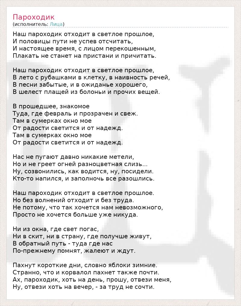 Наш пароходик отходит в светлое прошлое, И половицы пути не успев отсчитать, И настоящее время, с лицом перекошенным, Плакать не станет на пристани и причитать. Наш пароходик отходит в светлое прошлое, В лето с рубашками в клетку, в наивность речей, В песни забытые, и в ожиданье хорошего, В шелест плащей из болоньи и прочих вещей. В прошедшее, знакомое Туда, где февраль и прозрачен и свеж. Там в сумерках окно мое От радости светится и от надежд. Там в сумерках окно мое От радости светится и от надежд. Нас не пугают давно никакие метели, Но и не греет огней разноцветная слизь... Ну, созвонились, как водится, ну, посидели. Кто-то напился, и заполночь все разошлись. Наш пароходик отходит в светлое прошлое. Но без волнений отходит и без труда. Не потому, что так хочется нам невозможного, Просто не хочется больше уже никуда. Ни из окна, где свет погас, Ни в скит, ни в страну, где получше живут, В обратный путь - туда где нас По-прежнему помнят, жалеют и ждут. Пахнут короткие дни, словно яблоки зимние. Странно, что и корвалол пахнет также почти. Ах, пароходик, хоть на день, прошу, отвези меня, Ну, отвези хоть на вечер, - за труд не сочти.