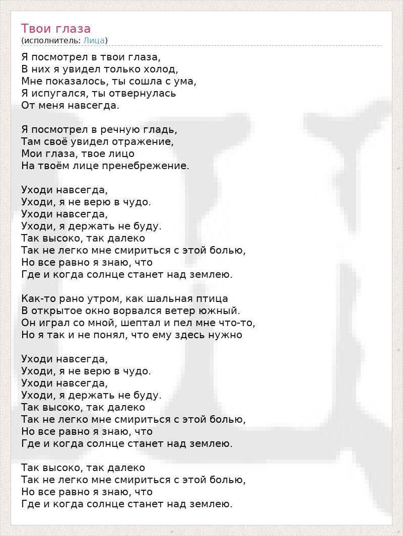 Я посмотрел в твои глаза, В них я увидел только холод, Мне показалось, ты сошла с ума, Я испугался, ты отвернулась От меня навсегда. Я посмотрел в речную гладь, Там своё увидел отражение, Мои глаза, твое лицо На твоём лице пренебрежение. Уходи навсегда, Уходи, я не верю в чудо. Уходи навсегда, Уходи, я держать не буду. Так высоко, так далеко Так не легко мне смириться с этой болью, Но все равно я знаю, что Где и когда солнце станет над землею. Как-то рано утром, как шальная птица В открытое окно ворвался ветер южный. Он играл со мной, шептал и пел мне что-то, Но я так и не понял, что ему здесь нужно Уходи навсегда, Уходи, я не верю в чудо. Уходи навсегда, Уходи, я держать не буду. Так высоко, так далеко Так не легко мне смириться с этой болью, Но все равно я знаю, что Где и когда солнце станет над землею. Так высоко, так далеко Так не легко мне смириться с этой болью, Но все равно я знаю, что Где и когда солнце станет над землею.
