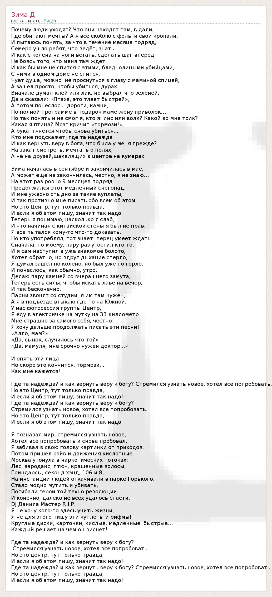 Почему люди уходят? Что они находят там, в дали, Где обитают мечты? А я все скоблю с фольги свои кропали. И пытаюсь понять, за что в течение месяца подряд, Семеро ушло ребят, что ведёт, знать, И как с колена на ноги встать, сделать шаг вперед, Не боясь того, что меня там ждет. И как бы мне не спится с этими, бледнолицыми убийцами, С ними в одном доме не спится. Чует душа, можно не проснуться в глазу с маминой спицей, А зашел просто, чтобы убиться, дурак. Вначале думал клей или лак, но выбрал что зеленей, Да и сказали: «Птаха, это тлеет быстрей», А потом понеслось: дороги, камни, По полной программе в подарок маме жену приволок… Но так понять и не смог я, кто я: лис или волк? Какой во мне толк? Какая я птица? Мозг кричит «тормози!», А рука тянется чтобы снова убиться... Кто мне подскажет, где та надежда И как вернуть веру в бога, что была у меня прежде? На закат смотреть, мечтать о полях, А не на друзей,шакалящих в центре на кумарах. Зима началась в сентябре и закончилась в мае, А может еще не закончилась, честно, я не знаю… На этот раз ровно 9 месяцев подряд Продолжался этот медленный снегопад. И мне ужасно стыдно за такие куплеты, И так противно мне писать обо всем об этом. Но это Центр, тут только правда, И если я об этом пишу, значит так надо. Теперь я понимаю, насколько я слаб, И что начиная с китайской стены я был не прав. Я все пытался кому-то что-то доказать, Но кто употреблял, тот знает: перец умеет ждать. Сначала, по-моему, пару раз угостил кто-то, И я сам наступил в уже знакомое болото, Хотел обратно, но вдруг дыхание сперло, Я думал зашел по колено, но был уже по горло. И понеслось, как обычно, утро, Делаю пару камней со вчерашнего замута, Теперь есть силы, чтобы искать лаве на вечер, И так бесконечно. Парни звонят со студии, я им там нужен, А я в подъезде втыкаю где-то на Южной. У нас фотосессия группы Центр, Я еду в электричке на мутку на 33 киллометр. Мне страшно за самого себя, честно! Я хочу дальше продолжать писать эти песни! «Алло, мам?» «Да, сынок, случилось что-то?» «Да, мамуля, мне срочно нужен доктор...» И опять эти лица! Но скоро это кончится, тормози... Как мне кажется! Где та надежда? и как вернуть веру к богу? Стремился узнать новое, хотел все попробовать. Но это Центр, тут только правда, И если я об этом пишу, значит так надо! Где та надежда? и как вернуть веру к богу? Стремился узнать новое, хотел все попробовать. Но это Центр, тут только правда, И если я об этом пишу, значит так надо. Я познавал мир, стремился узнать новое, Хотел все попробовать и снова пробовал. Я забивал в свою голову картинки от приходов, Потом пришёл рэйв и движения кислотные. Москва утонула в наркотических потоках: Лес, аэроданс, птюч, крашенные волосы, Гриндарсы, секонд хэнд, 106 и 8, На инстанции людей откачивали в парке Горького. Стало модно мутить и убивать, Погибали герои той техно революции. И конечно, далеко не всех удалось спасти… Dj Данила Мастер R.I.P. Я не хочу кого-то здесь учить жизни, Я не для этого пишу эти куплеты и рифмы! Круглые диски, картонки, кислые, медленные, быстрые… Каждый решает на чем он виснет! Где та надежда? и как вернуть веру к богу? Стремился узнать новое, хотел все попробовать. Но это центр, тут только правда, И если я об этом пишу, значит так надо! Где та надежда? и как вернуть веру к богу? Стремился узнать новое, хотел все попробовать. Но это центр, тут только правда, И если я об этом пишу
