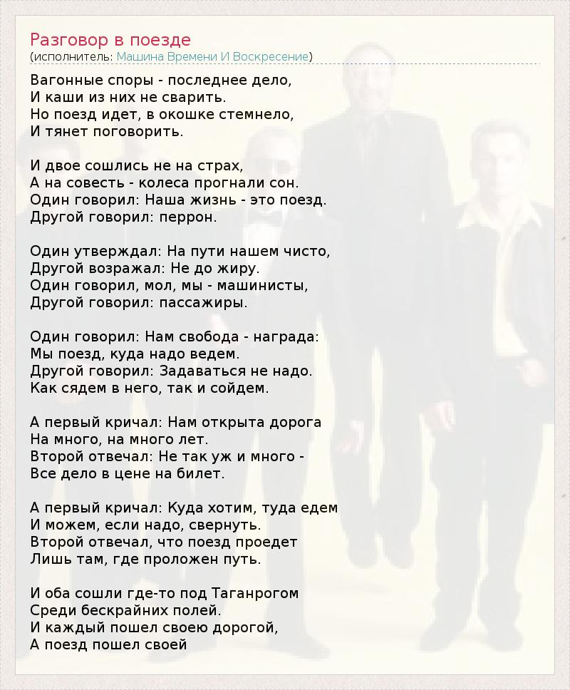 Вагонные споры - последнее дело, И каши из них не сварить. Но поезд идет, в окошке стемнело, И тянет поговорить. И двое сошлись не на страх, А на совесть - колеса прогнали сон. Один говорил: Наша жизнь - это поезд. Другой говорил: перрон. Один утверждал: На пути нашем чисто, Другой возражал: Не до жиру. Один говорил, мол, мы - машинисты, Другой говорил: пассажиры. Один говорил: Нам свобода - награда: Мы поезд, куда надо ведем. Другой говорил: Задаваться не надо. Как сядем в него, так и сойдем. А первый кричал: Нам открыта дорога На много, на много лет. Второй отвечал: Не так уж и много - Все дело в цене на билет. А первый кричал: Куда хотим, туда едем И можем, если надо, свернуть. Второй отвечал, что поезд проедет Лишь там, где проложен путь. И оба сошли где-то под Таганрогом Среди бескрайних полей. И каждый пошел своею дорогой, А поезд пошел своей Машина времени - Разговор в поезде - Текст песни, слушать онлайн Машина времени - Разговор в поезде - Текст песни, слушать онлайн