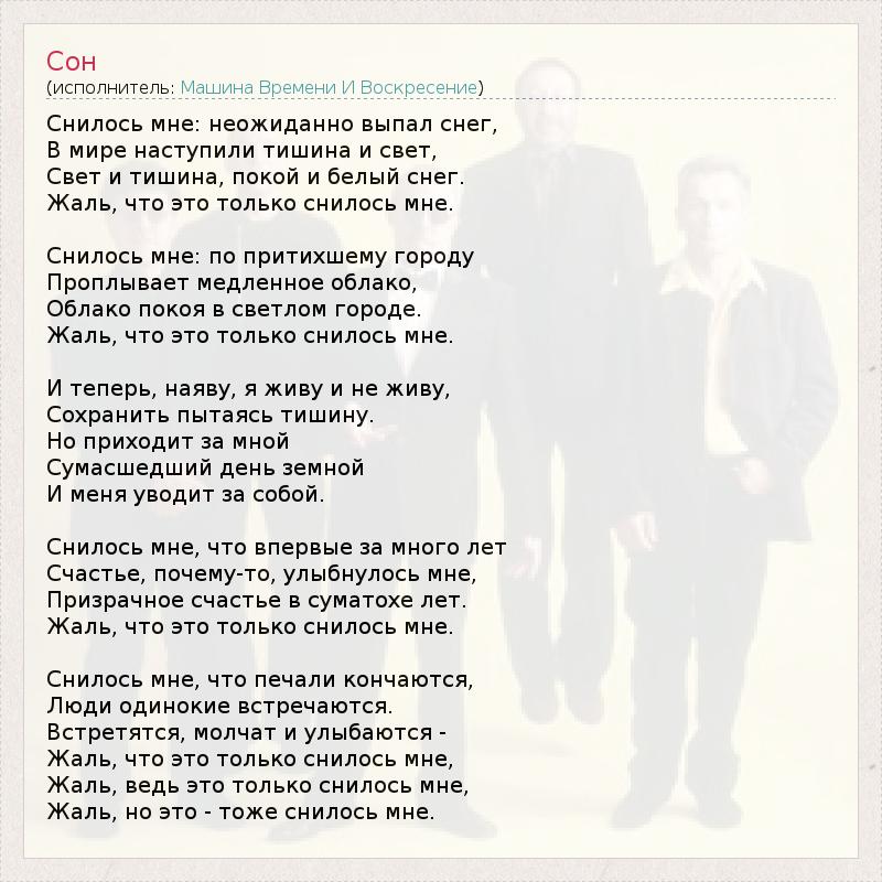Снилось мне: неожиданно выпал снег, В мире наступили тишина и свет, Свет и тишина, покой и белый снег. Жаль, что это только снилось мне. Снилось мне: по притихшему городу Проплывает медленное облако, Облако покоя в светлом городе. Жаль, что это только снилось мне. И теперь, наяву, я живу и не живу, Сохранить пытаясь тишину. Но приходит за мной Сумасшедший день земной И меня уводит за собой. Снилось мне, что впервые за много лет Счастье, почему-то, улыбнулось мне, Призрачное счастье в суматохе лет. Жаль, что это только снилось мне. Снилось мне, что печали кончаются, Люди одинокие встречаются. Встретятся, молчат и улыбаются - Жаль, что это только снилось мне, Жаль, ведь это только снилось мне, Жаль, но это - тоже снилось мне.