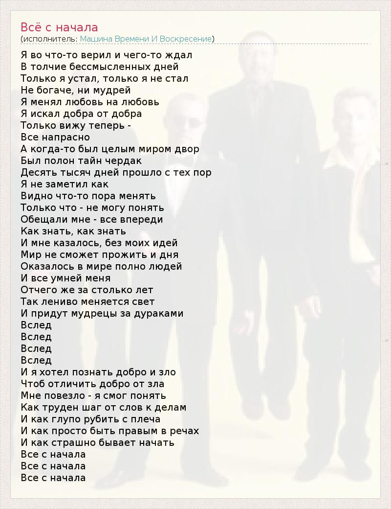 Я во что-то верил и чего-то ждал В толчие бессмысленных дней Только я устал, только я не стал Не богаче, ни мудрей Я менял любовь на любовь Я искал добра от добра Только вижу теперь - Все напрасно А когда-то был целым миром двор Был полон тайн чердак Десять тысяч дней прошло с тех пор Я не заметил как Видно что-то пора менять Только что - не могу понять Обещали мне - все впереди Как знать, как знать И мне казалось, без моих идей Мир не сможет прожить и дня Оказалось в мире полно людей И все умней меня Отчего же за столько лет Так лениво меняется свет И придут мудрецы за дураками Вслед Вслед Вслед Вслед И я хотел познать добро и зло Чтоб отличить добро от зла Мне повезло - я смог понять Как труден шаг от слов к делам И как глупо рубить с плеча И как просто быть правым в речах И как страшно бывает начать Все с начала Все с начала Все с начала