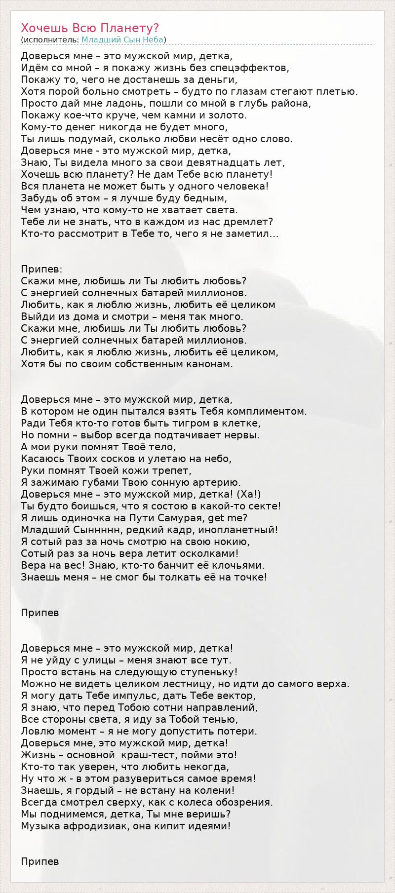 ГлавнаяИсполнителиМладший Сын НебаХочешь Всю Планету?