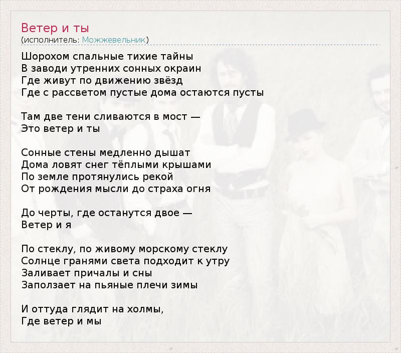 Шорохом спальные тихие тайны В заводи утренних сонных окраин Где живут по движению звёзд Где с рассветом пустые дома остаются пусты Там две тени сливаются в мост — Это ветер и ты Сонные стены медленно дышат Дома ловят снег тёплыми крышами По земле протянулись рекой От рождения мысли до страха огня До черты, где останутся двое — Ветер и я По стеклу, по живому морскому стеклу Солнце гранями света подходит к утру Заливает причалы и сны Заползает на пьяные плечи зимы И оттуда глядит на холмы, Где ветер и мы