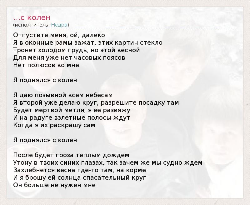 Отпустите меня, ой, далеко Я в оконные рамы зажат, этих картин стекло Тронет холодом грудь, но этой весной Для меня уже нет часовых поясов Нет полюсов во мне Я поднялся с колен Я даю позывной всем небесам Я второй уже делаю круг, разрешите посадку там Будет мертвой метля, я ее развяжу И на радуге взлетные полосы ждут Когда я их раскрашу сам Я поднялся с колен После будет гроза теплым дождем Утону в твоих синих глазах, так зачем же мы судно ждем Захлебнется весна где-то там, на корме И я брошу ей солнца спасательный круг Он больше не нужен мне