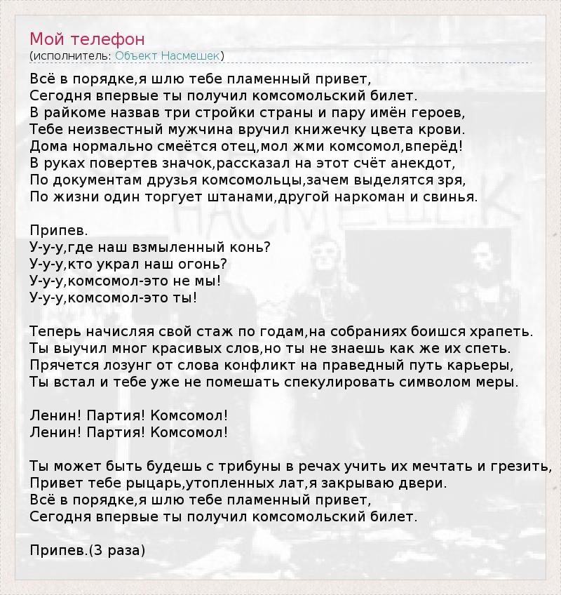 Всё в порядке,я шлю тебе пламенный привет, Сегодня впервые ты получил комсомольский билет. В райкоме назвав три стройки страны и пару имён героев, Тебе неизвестный мужчина вручил книжечку цвета крови. Дома нормально смеётся отец,мол жми комсомол,вперёд! В руках повертев значок,рассказал на этот счёт анекдот, По документам друзья комсомольцы,зачем выделятся зря, По жизни один торгует штанами,другой наркоман и свинья. Припев. У-у-у,где наш взмыленный конь? У-у-у,кто украл наш огонь? У-у-у,комсомол-это не мы! У-у-у,комсомол-это ты! Теперь начисляя свой стаж по годам,на собраниях боишся храпеть. Ты выучил мног красивых слов,но ты не знаешь как же их спеть. Прячется лозунг от слова конфликт на праведный путь карьеры, Ты встал и тебе уже не помешать спекулировать символом меры. Ленин! Партия! Комсомол! Ленин! Партия! Комсомол! Ты может быть будешь с трибуны в речах учить их мечтать и грезить, Привет тебе рыцарь,утопленных лат,я закрываю двери. Всё в порядке,я шлю тебе пламенный привет, Сегодня впервые ты получил комсомольский билет. Припев.(3 раза)