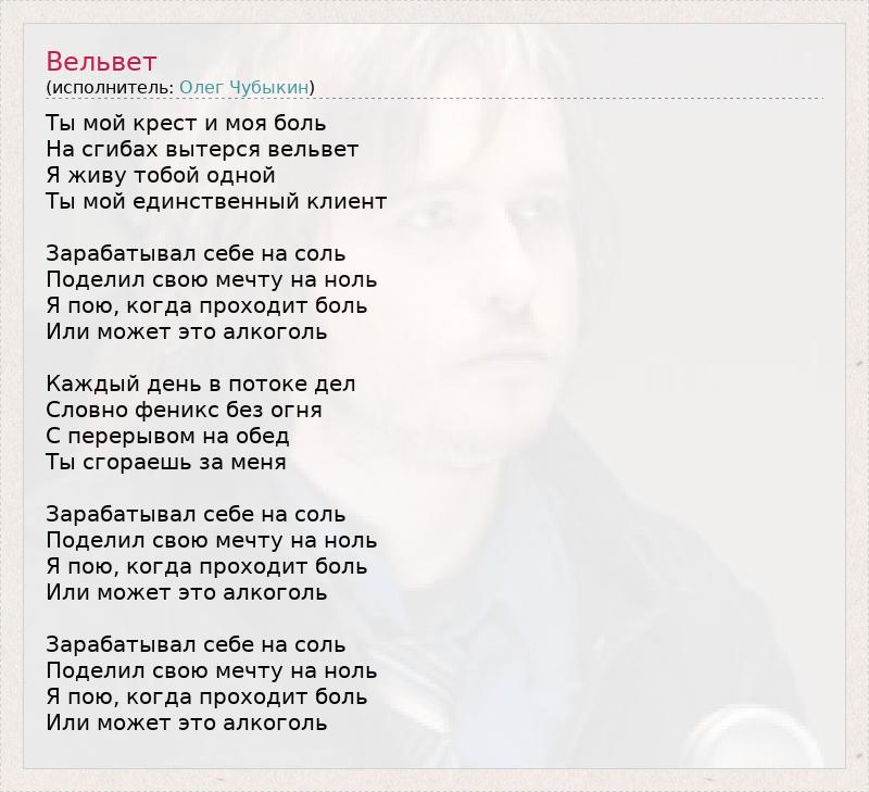 Это интересно:БиографияОлег Чубыкин родился в 1974 году в г. Арсеньев (Приморский край), известном своими горнолыжными трассами и авиастроительным заводом. С 13 лет увлекся рок-музыкой услышав записи The Beatles. Первые музыкальные опыты начал в 14 лет, собрав школьную группу. ТандемВ 1991 году Олег Чубыкин переехал во Владивосток, где в 1993 с Павлом Руминовым и Александром Ивановым собрал группу... продолжение