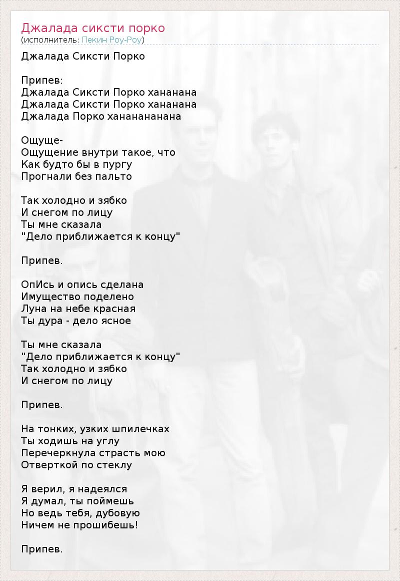 Джалада Сиксти Порко Припев: Джалада Сиксти Порко хананана Джалада Сиксти Порко хананана Джалада Порко хананананана Ощуще- Ощущение внутри такое, что Как будто бы в пургу Прогнали без пальто Так холодно и зябко И снегом по лицу Ты мне сказала "Дело приближается к концу" Припев. ОпИсь и опись сделана Имущество поделено Луна на небе красная Ты дура - дело ясное Ты мне сказала "Дело приближается к концу" Так холодно и зябко И снегом по лицу Припев. На тонких, узких шпилечках Ты ходишь на углу Перечеркнула страсть мою Отверткой по стеклу Я верил, я надеялся Я думал, ты поймешь Но ведь тебя, дубовую Ничем не прошибешь! Припев.