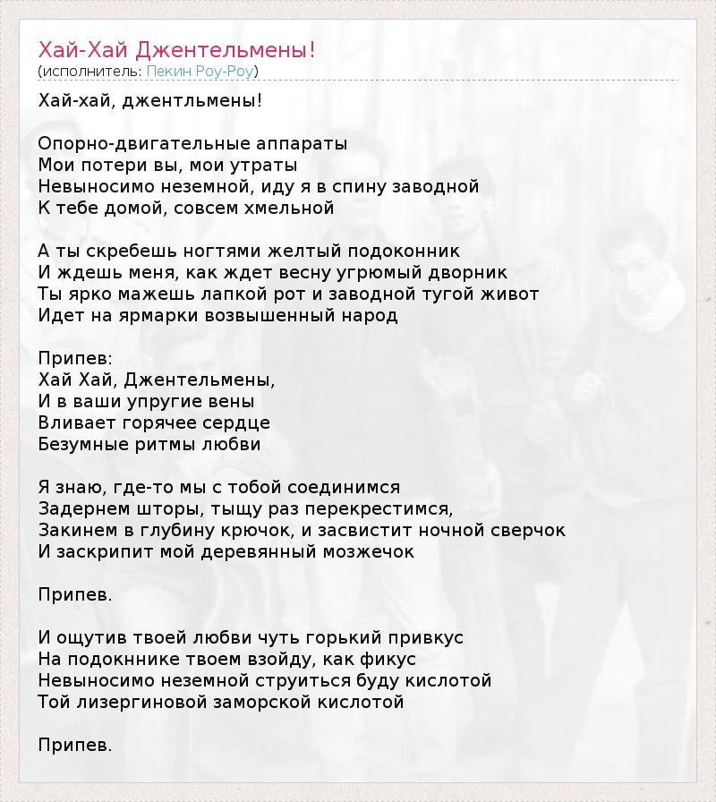 Хай-хай, джентльмены! Опорно-двигательные аппараты Мои потери вы, мои утраты Невыносимо неземной, иду я в спину заводной К тебе домой, совсем хмельной А ты скребешь ногтями желтый подоконник И ждешь меня, как ждет весну угрюмый дворник Ты ярко мажешь лапкой рот и заводной тугой живот Идет на ярмарки возвышенный народ Припев: Хай Хай, Джентельмены, И в ваши упругие вены Вливает горячее сердце Безумные ритмы любви Я знаю, где-то мы с тобой соединимся Задернем шторы, тыщу раз перекрестимся, Закинем в глубину крючок, и засвистит ночной сверчок И заскрипит мой деревянный мозжечок Припев. И ощутив твоей любви чуть горький привкус На подокннике твоем взойду, как фикус Невыносимо неземной струиться буду кислотой Той лизергиновой заморской кислотой Припев.