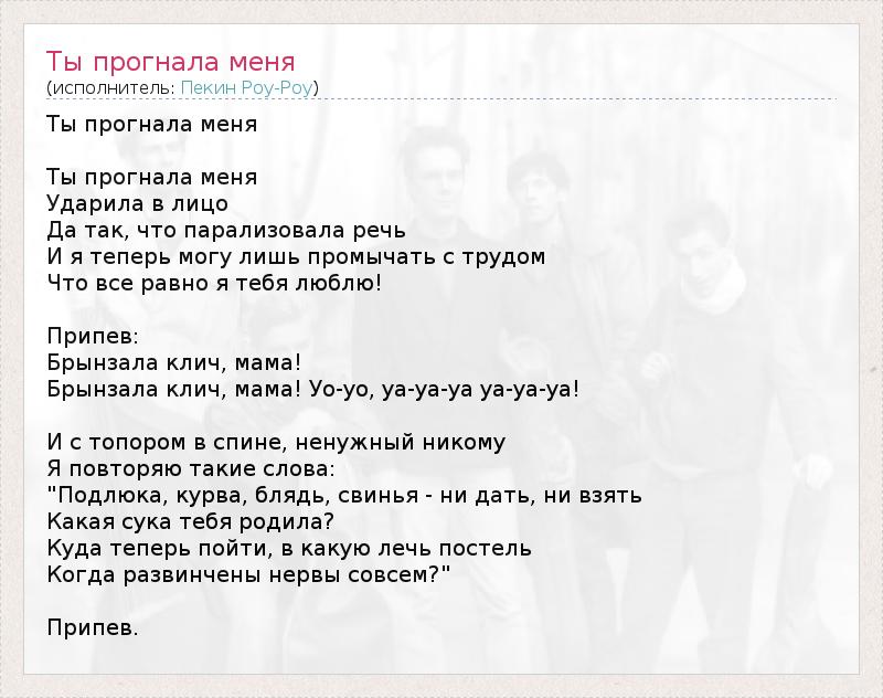 Ты прогнала меня Ты прогнала меня Ударила в лицо Да так, что парализовала речь И я теперь могу лишь промычать с трудом Что все равно я тебя люблю! Припев: Брынзала клич, мама! Брынзала клич, мама! Уо-уо, уа-уа-уа уа-уа-уа! И с топором в спине, ненужный никому Я повторяю такие слова: "Подлюка, курва, блядь, свинья - ни дать, ни взять Какая сука тебя родила? Куда теперь пойти, в какую лечь постель Когда развинчены нервы совсем?" Припев.