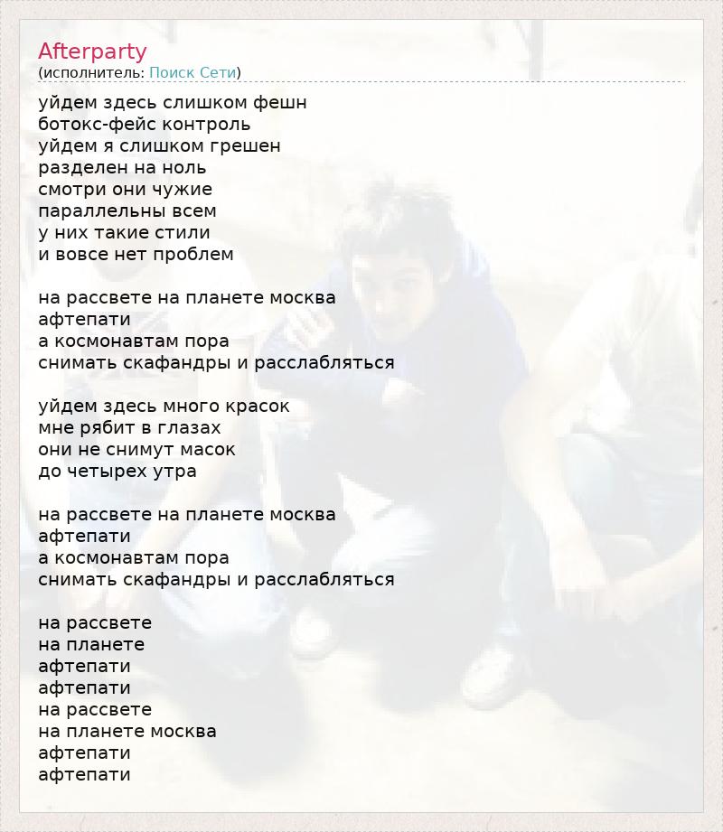 уйдем здесь слишком фешн ботокс-фейс контроль уйдем я слишком грешен разделен на ноль смотри они чужие параллельны всем у них такие стили и вовсе нет проблем на рассвете на планете москва афтепати а космонавтам пора снимать скафандры и расслабляться уйдем здесь много красок мне рябит в глазах они не снимут масок до четырех утра на рассвете на планете москва афтепати а космонавтам пора снимать скафандры и расслабляться на рассвете на планете афтепати афтепати на рассвете на планете москва афтепати афтепати