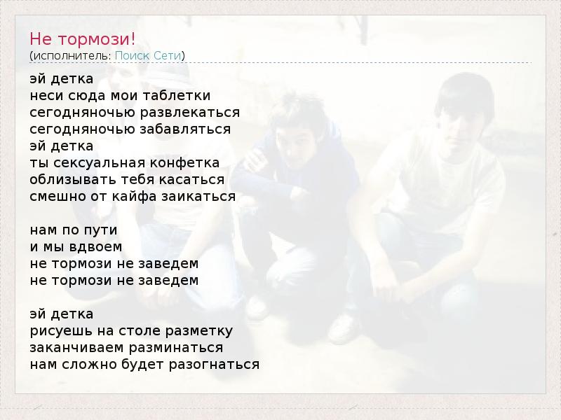 эй детка неси сюда мои таблетки сегодняночью развлекаться сегодняночью забавляться эй детка ты сексуальная конфетка облизывать тебя касаться смешно от кайфа заикаться нам по пути и мы вдвоем не тормози не заведем не тормози не заведем эй детка рисуешь на столе разметку заканчиваем разминаться нам сложно будет разогнаться