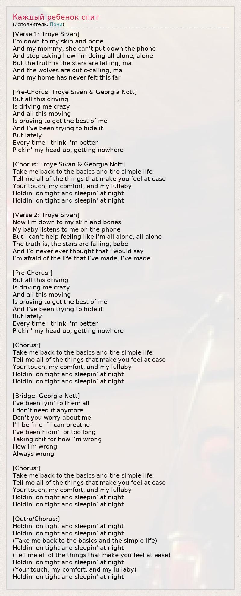 [Verse 1: Troye Sivan] I'm down to my skin and bone And my mommy, she can't put down the phone And stop asking how I'm doing all alone, alone But the truth is the stars are falling, ma And the wolves are out c-calling, ma And my home has never felt this far [Pre-Chorus: Troye Sivan & Georgia Nott] But all this driving Is driving me crazy And all this moving Is proving to get the best of me And I've been trying to hide it But lately Every time I think I'm better Pickin' my head up, getting nowhere [Chorus: Troye Sivan & Georgia Nott] Take me back to the basics and the simple life Tell me all of the things that make you feel at ease Your touch, my comfort, and my lullaby Holdin' on tight and sleepin' at night Holdin' on tight and sleepin' at night [Verse 2: Troye Sivan] Now I'm down to my skin and bones My baby listens to me on the phone But I can't help feeling like I'm all alone, all alone The truth is, the stars are falling, babe And I'd never ever thought that I would say I'm afraid of the life that I've made, I've made [Pre-Chorus:] But all this driving Is driving me crazy And all this moving Is proving to get the best of me And I've been trying to hide it But lately Every time I think I'm better Pickin' my head up, getting nowhere [Chorus:] Take me back to the basics and the simple life Tell me all of the things that make you feel at ease Your touch, my comfort, and my lullaby Holdin' on tight and sleepin' at night Holdin' on tight and sleepin' at night [Bridge: Georgia Nott] I've been lyin' to them all I don't need it anymore Don't you worry about me I'll be fine if I can breathe I've been hidin' for too long Taking shit for how I'm wrong How I'm wrong Always wrong [Chorus:] Take me back to the basics and the simple life Tell me all of the things that make you feel at ease Your touch, my comfort, and my lullaby Holdin' on tight and sleepin' at night Holdin' on tight and sleepin' at night [Outro/Chorus:] Holdin' on tight and sleepin' at night Holdin' on tight and sleepin' at night (Take me back to the basics and the simple life) Holdin' on tight and sleepin' at night (Tell me all of the things that make you feel at ease) Holdin' on tight and sleepin' at night (Your touch, my comfort, and my lullaby) Holdin' on tight and sleepin' at night