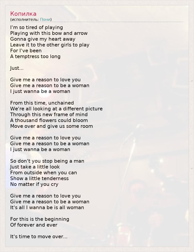 I'm so tired of playing Playing with this bow and arrow Gonna give my heart away Leave it to the other girls to play For I've been A temptress too long Just... Give me a reason to love you Give me a reason to be a woman I just wanna be a woman From this time, unchained We're all looking at a different picture Through this new frame of mind A thousand flowers could bloom Move over and give us some room Give me a reason to love you Give me a reason to be a woman I just wanna be a woman So don't you stop being a man Just take a little look From outside when you can Show a little tenderness No matter if you cry Give me a reason to love you Give me a reason to be a woman It's all I wanna be is all woman For this is the beginning Of forever and ever It's time to move over...