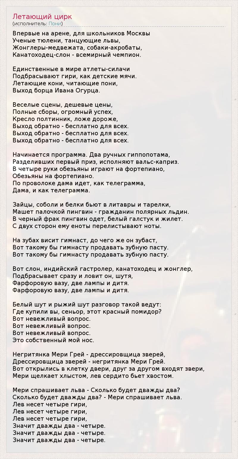 Впервые на арене, для школьников Москвы Ученые тюлени, танцующие львы, Жонглеры-медвежата, собаки-акробаты, Канатоходец-слон - всемирный чемпион. Единственные в мире атлеты-силачи Подбрасывают гири, как детские мячи. Летающие кони, читающие пони, Выход борца Ивана Огурца. Веселые сцены, дешевые цены, Полные сборы, огромный успех, Кресло полтинник, ложе дороже, Выход обратно - бесплатно для всех. Выход обратно - бесплатно для всех. Выход обратно - бесплатно для всех. Начинается программа. Два ручных гиппопотама, Разделивших первый приз, исполняют вальс-каприз. В четыре руки обезьяны играют на фортепиано, Обезьяны на фортепиано. По проволоке дама идет, как телеграмма, Дама, и как телеграмма. Зайцы, соболи и белки бьют в литавры и тарелки, Машет палочкой пингвин - гражданин полярных льдин. В черный фрак пингвин одет, белый галстук и жилет. С двух сторон ему еноты перелистывают ноты. На зубах висит гимнаст, до чего же он зубаст, Вот такому бы гимнасту продавать зубную пасту. Вот такому бы гимнасту продавать зубную пасту. Вот слон, индийский гастролер, канатоходец и жонглер, Подбрасывает сразу и ловит он, шутя, Фарфоровую вазу, две лампы и дитя. Фарфоровую вазу, две лампы и дитя. Белый шут и рыжий шут разговор такой ведут: Где купили вы, сеньор, этот красный помидор? Вот невежливый вопрос. Вот невежливый вопрос. Вот невежливый вопрос. Это собственный мой нос. Негритянка Мери Грей - дрессировщица зверей, Дрессировщица зверей - негритянка Мери Грей. Вот открылись в клетку двери, друг за другом входят звери, Мери щелкает хлыстом, лев сердито бьет хвостом. Мери спрашивает льва - Сколько будет дважды два? Сколько будет дважды два? - Мери спрашивает льва. Лев несет четыре гири, Лев несет четыре гири, Лев несет четыре гири, Значит дважды два - четыре. Значит дважды два - четыре. Значит дважды два - четыре.