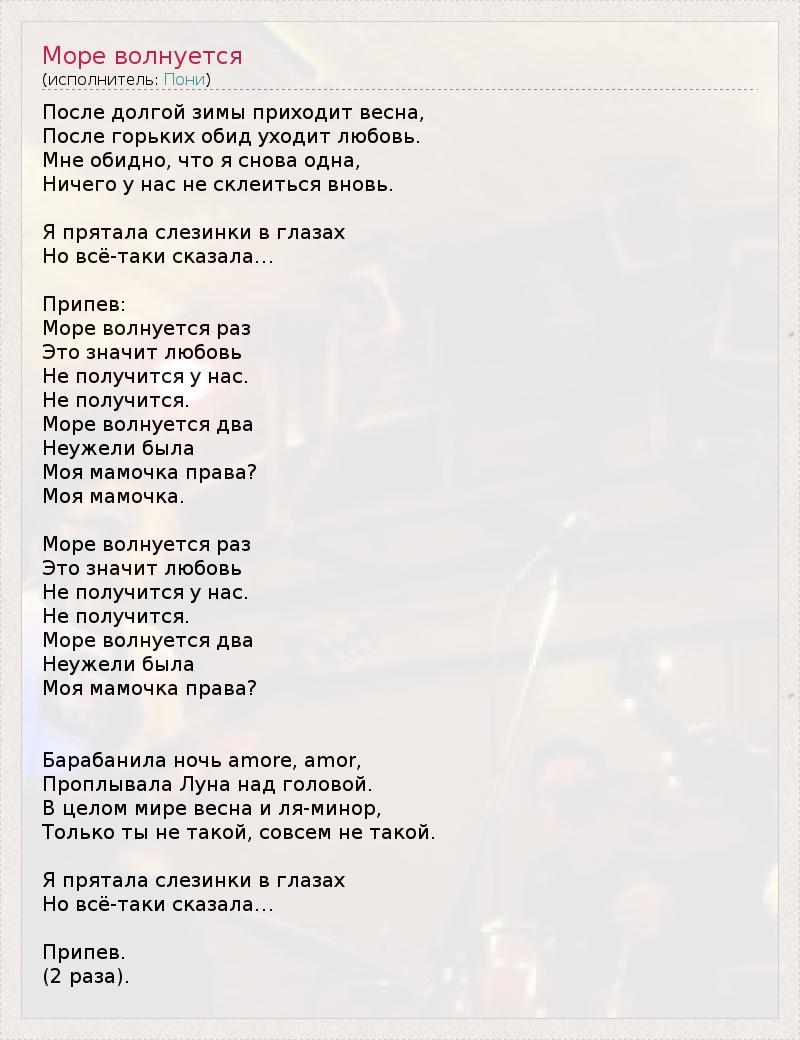После долгой зимы приходит весна, После горьких обид уходит любовь. Мне обидно, что я снова одна, Ничего у нас не склеиться вновь. Я прятала слезинки в глазах Но всё-таки сказала… Припев: Море волнуется раз Это значит любовь Не получится у нас. Не получится. Море волнуется два Неужели была Моя мамочка права? Моя мамочка. Море волнуется раз Это значит любовь Не получится у нас. Не получится. Море волнуется два Неужели была Моя мамочка права? Барабанила ночь аmore, amor, Проплывала Луна над головой. В целом мире весна и ля-минор, Только ты не такой, совсем не такой. Я прятала слезинки в глазах Но всё-таки сказала… Припев. (2 раза).