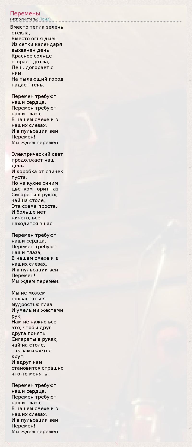 Вместо тепла зелень стекла, Вместо огня дым. Из сетки календаря выхвачен день. Красное солнце сгорает дотла, День догорает с ним. На пылающий город падает тень. Перемен требуют наши сердца, Перемен требуют наши глаза, В нашем смехе и в наших слезах, И в пульсации вен Перемен! Мы ждем перемен. Электрический свет продолжает наш день И коробка от спичек пуста. Но на кухне синим цветком горит газ. Сигареты в руках, чай на столе, Эта схема проста. И больше нет ничего, все находится в нас. Перемен требуют наши сердца, Перемен требуют наши глаза, В нашем смехе и в наших слезах, И в пульсации вен Перемен! Мы ждем перемен. Мы не можем похвастаться мудростью глаз И умелыми жестами рук, Нам не нужно все это, чтобы друг друга понять. Сигареты в руках, чай на столе, Так замыкается круг. И вдруг нам становится страшно что-то менять. Перемен требуют наши сердца, Перемен требуют наши глаза, В нашем смехе и в наших слезах, И в пульсации вен Перемен! Мы ждем перемен.
