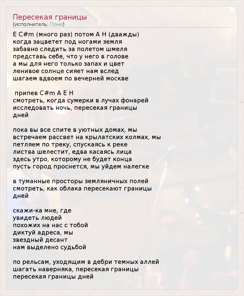 E C#m (много раз) потом A H (дважды) когда зацветет под ногами земля забавно следить за полетом шмеля представь себе, что у него в голове а мы для него только запах и цвет ленивое солнце сияет нам вслед шагаем вдвоем по вечерней москве припев C#m A E H смотреть, когда сумерки в лучах фонарей исследовать ночь, пересекая границы дней пока вы все спите в уютных домах, мы встречаем рассвет на крылатских колмах, мы петляем по треку, спускаясь к реке листва шелестит, едва касаясь лица здесь утро, которому не будет конца пусть город проснется, мы уйдем налегке в туманные просторы земляничных полей смотреть, как облака пересекают границы дней скажи-ка мне, где увидеть людей похожих на нас с тобой диктуй адреса, мы звездный десант нам выделено судьбой по рельсам, уходящим в дебри темных аллей шагать наверняка, пересекая границы пересекая границы дней