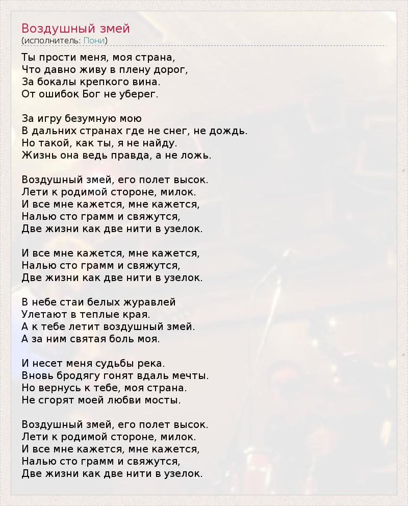 Ты прости меня, моя страна, Что давно живу в плену дорог, За бокалы крепкого вина. От ошибок Бог не уберег. За игру безумную мою В дальних странах где не снег, не дождь. Но такой, как ты, я не найду. Жизнь она ведь правда, а не ложь. Воздушный змей, его полет высок. Лети к родимой стороне, милок. И все мне кажется, мне кажется, Налью сто грамм и свяжутся, Две жизни как две нити в узелок. И все мне кажется, мне кажется, Налью сто грамм и свяжутся, Две жизни как две нити в узелок. В небе стаи белых журавлей Улетают в теплые края. А к тебе летит воздушный змей. А за ним святая боль моя. И несет меня судьбы река. Вновь бродягу гонят вдаль мечты. Но вернусь к тебе, моя страна. Не сгорят моей любви мосты. Воздушный змей, его полет высок. Лети к родимой стороне, милок. И все мне кажется, мне кажется, Налью сто грамм и свяжутся, Две жизни как две нити в узелок.