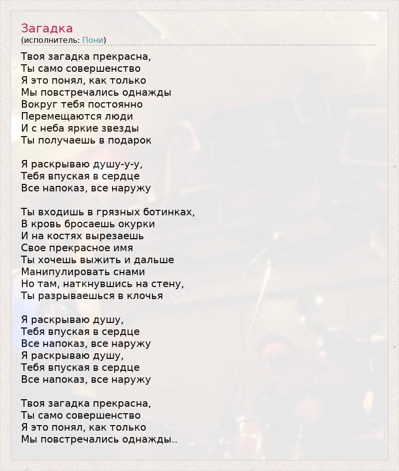Твоя загадка прекрасна, Ты само совершенство Я это понял, как только Мы повстречались однажды Вокруг тебя постоянно Перемещаются люди И с неба яркие звезды Ты получаешь в подарок Я раскрываю душу-у-у, Тебя впуская в сердце Все напоказ, все наружу Ты входишь в грязных ботинках, В кровь бросаешь окурки И на костях вырезаешь Свое прекрасное имя Ты хочешь выжить и дальше Манипулировать снами Но там, наткнувшись на стену, Ты разрываешься в клочья Я раскрываю душу, Тебя впуская в сердце Все напоказ, все наружу Я раскрываю душу, Тебя впуская в сердце Все напоказ, все наружу Твоя загадка прекрасна, Ты само совершенство Я это понял, как только Мы повстречались однажды..