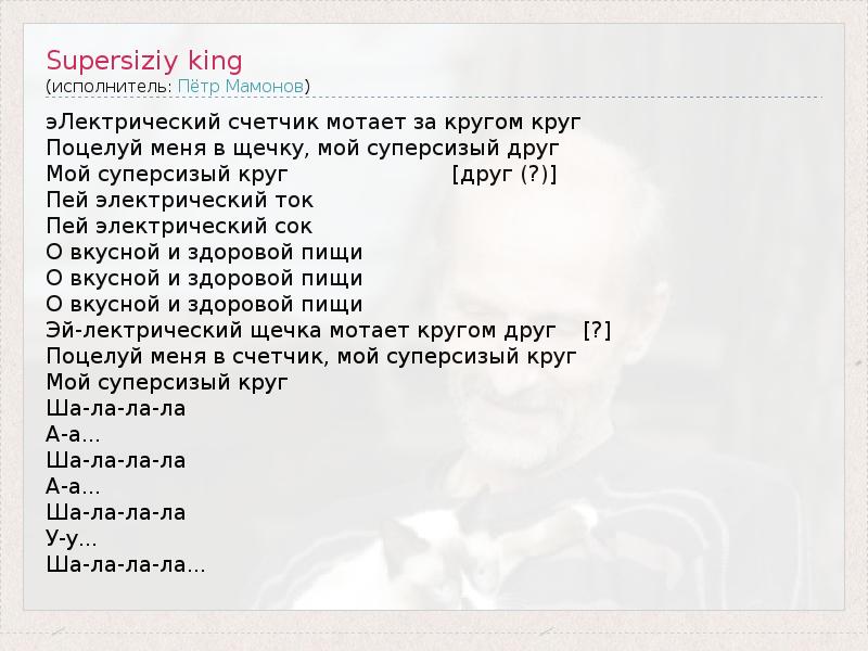 эЛектрический счетчик мотает за кругом круг Поцелуй меня в щечку, мой суперсизый друг Мой суперсизый круг [друг (?)] Пей электрический ток Пей электрический сок О вкусной и здоровой пищи О вкусной и здоровой пищи О вкусной и здоровой пищи Эй-лектрический щечка мотает кругом друг [?] Поцелуй меня в счетчик, мой суперсизый круг Мой суперсизый круг Ша-ла-ла-ла А-а... Ша-ла-ла-ла А-а... Ша-ла-ла-ла У-у... Ша-ла-ла-ла...