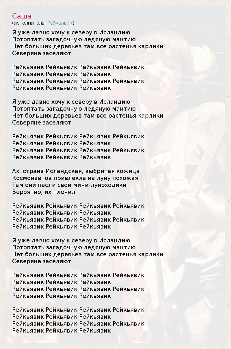 Я уже давно хочу к северу в Исландию Потоптать загадочную ледяную мантию Нет больших деревьев там все растенья карлики Северяне заселяют Рейкьявик Рейкьявик Рейкьявик Рейкьявик Рейкьявик Рейкьявик Рейкьявик Рейкьявик Рейкьявик Рейкьявик Рейкьявик Рейкьявик Рейкьявик Рейкьявик Я уже давно хочу к северу в Исландию Потоптать загадочную ледяную мантию Нет больших деревьев там все растенья карлики Северяне заселяют Рейкьявик Рейкьявик Рейкьявик Рейкьявик Рейкьявик Рейкьявик Рейкьявик Рейкьявик Рейкьявик Рейкьявик Рейкьявик Рейкьявик Рейкьявик Рейкьявик Ах, страна Исландская, выбритая кожица Космонавтов привлекла на луну похожая Там они пасли свои мини-луноходики Вероятно, их пленил Рейкьявик Рейкьявик Рейкьявик Рейкьявик Рейкьявик Рейкьявик Рейкьявик Рейкьявик Рейкьявик Рейкьявик Рейкьявик Рейкьявик Рейкьявик Рейкьявик Я уже давно хочу к северу в Исландию Потоптать загадочную ледяную мантию Нет больших деревьев там все растенья карлики Северяне заселяют Рейкьявик Рейкьявик Рейкьявик Рейкьявик Рейкьявик Рейкьявик Рейкьявик Рейкьявик Рейкьявик Рейкьявик Рейкьявик Рейкьявик Рейкьявик Рейкьявик Рейкьявик Рейкьявик Рейкьявик Рейкьявик Рейкьявик Рейкьявик Рейкьявик Рейкьявик Рейкьявик Рейкьявик Рейкьявик Рейкьявик Рейкьявик Рейкьявик