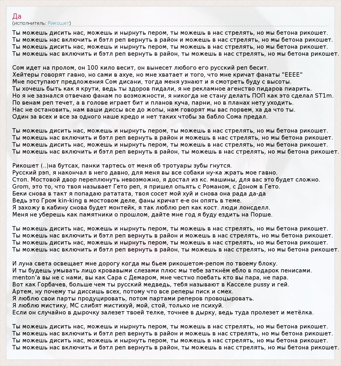 Ты можешь дисить нас, можешь и нырнуть пером, ты можешь в нас стрелять, но мы бетона рикошет. Ты можешь нас включить и бэтл реп вернуть в район и можешь в нас стрелять, но мы бетона рикошет. Ты можешь дисить нас, можешь и нырнуть пером, ты можешь в нас стрелять, но мы бетона рикошет. Ты можешь нас включить и бэтл реп вернуть в район, ты можешь в нас стрелять, но мы бетона рикошет. Сом идет на пролом, он 100 кило весит, он вынесет любого его русский реп бесит. Хейтеры говорят гавно, но сами в ахуе, но мне хватает и того, что мне кричат фанаты "ЕЕЕЕ" Мне поступают предложения Сом дисани, тогда меня узнают и я смотреть буду с высоты. Ты хочешь быть как я крути, ведь ты здоров пидали, я не рекламное агенство пидаров пиарить. Но я не зазнался отвечаю фанам по возможности, я никогда не стану делать ПОП как это сделал ST1m. По венам реп течет, а в голове играет бит и планов куча, парни, но в планах нету уходить. Нас не остановить, нам ваши диссы все до жопы, нам говорят мы вас порвем, ха да что ты. Один за всех и все за одного наше кредо и нет таких чтобы за бабло Сома предал. Ты можешь дисить нас, можешь и нырнуть пером, ты можешь в нас стрелять, но мы бетона рикошет. Ты можешь нас включить и бэтл реп вернуть в район и можешь в нас стрелять, но мы бетона рикошет. Ты можешь дисить нас, можешь и нырнуть пером, ты можешь в нас стрелять, но мы бетона рикошет. Ты можешь нас включить и бэтл реп вернуть в район, ты можешь в нас стрелять, но мы бетона рикошет. Рикошет (..)на бутсах, панки тартесь от меня об тротуары зубы гнутся. Русский рэп, я накончал в него давно, для меня вы все собаки ну-ка жрать мое гавно. Стоп. Мостовой двор переплюнуть невозможно, я достал из кс. машины, для вас это будет сложно. Grom, это то, что твоя называет Гето реп, я пришел опьять с Романом, с Доном в Гето. Беки снова в такт я попадаю рататата, твоя сосет мой хуй и снова она рада да-да Ведь это Гром kin-king в мостовом деле, фаны кричат е-е он опять в теме. Я захожу в кабину снова будет монтейк, я так люблю реп как кост. люди лонсделл. Меня не уберешь как памятники о прошлом, дайте мне год я буду ездить на Порше. Ты можешь дисить нас, можешь и нырнуть пером, ты можешь в нас стрелять, но мы бетона рикошет. Ты можешь нас включить и бэтл реп вернуть в район и можешь в нас стрелять, но мы бетона рикошет. Ты можешь дисить нас, можешь и нырнуть пером, ты можешь в нас стрелять, но мы бетона рикошет. Ты можешь нас включить и бэтл реп вернуть в район, ты можешь в нас стрелять, но мы бетона рикошет. И луна света освещает мне дорогу когда мы бьем рикошетом-репом по твоему блоку. И ты будешь умывать лицо кровавыми слезами плюс мы тебе заткнём ебло в подарок пенисами. menton'a вы не с нами, вы как Сара с Демаром, мне честно поебать кто вы пара, не пара. Вот как Горбачев, больше чем ты русский медведь, тебя называют в Касселе pussy и гей. Артем, ну почему ты диссишь всех, потому что все реперы писк и смех. Я люблю свои парты продуцировать, потом партами реперов провоцыровать. Я люблю мистику, МС слибят мистихуй, мой, стой, только не психуй. Если он случайно в дырочку залезет твоей телке, точнее в дырку, ведь туда пролезет и метёлка. Ты можешь дисить нас, можешь и нырнуть пером, ты можешь в нас стрелять, но мы бетона рикошет. Ты можешь нас включить и бэтл реп вернуть в район и можешь в нас стрелять, но мы бетона рикошет. Ты можешь дисить нас, можешь и нырнуть пером, ты можешь в