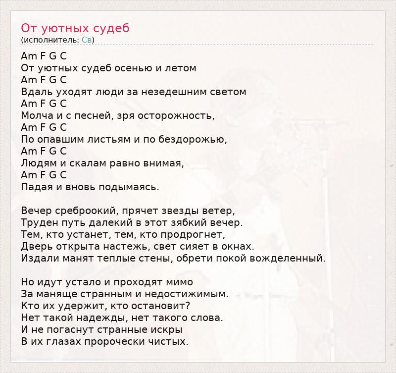 Am F G C From cozy destinies autumn and summer Am F G C Far people go for light nezedeshnim Am F G C Silently and with the song , in vain caution Am F G C On fallen leaves and on the road, Am F G C People are still listening and rocks , Am F G C Falling and rising again . Evening srebrooky hides the star wind Hard way away in the chilly evening. Those who are tired , those who prodrognet , The door is wide open , the light shines in the windows. From a distance beckon warm walls , find peace lust. But are tired and tested by For tantalizingly strange and elusive. Who keeps them who stay? No such hope , there is no such word. And do not go off strange sparks In their eyes, prophetically net .