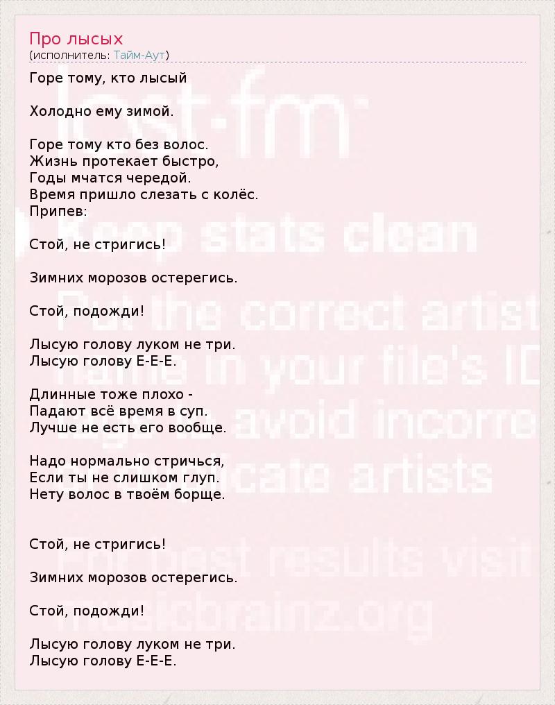 Горе тому, кто лысый Холодно ему зимой. Горе тому кто без волос. Жизнь протекает быстро, Годы мчатся чередой. Время пришло слезать с колёс. Припев: Стой, не стригись! Зимних морозов остерегись. Стой, подожди! Лысую голову луком не три. Лысую голову Е-Е-Е. Длинные тоже плохо - Падают всё время в суп. Лучше не есть его вообще. Надо нормально стричься, Если ты не слишком глуп. Нету волос в твоём борще. Стой, не стригись! Зимних морозов остерегись. Стой, подожди! Лысую голову луком не три. Лысую голову Е-Е-Е.