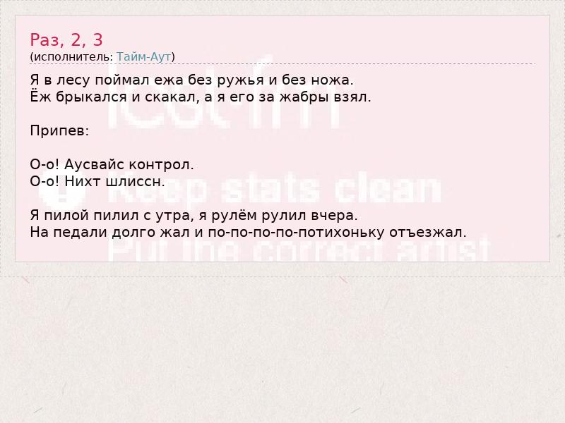 Я в лесу поймал ежа без ружья и без ножа. Ёж брыкался и скакал, а я его за жабры взял. Припев: О-о! Аусвайс контрол. О-о! Нихт шлиссн. Я пилой пилил с утра, я рулём рулил вчера. На педали долго жал и по-по-по-по-потихоньку отъезжал.