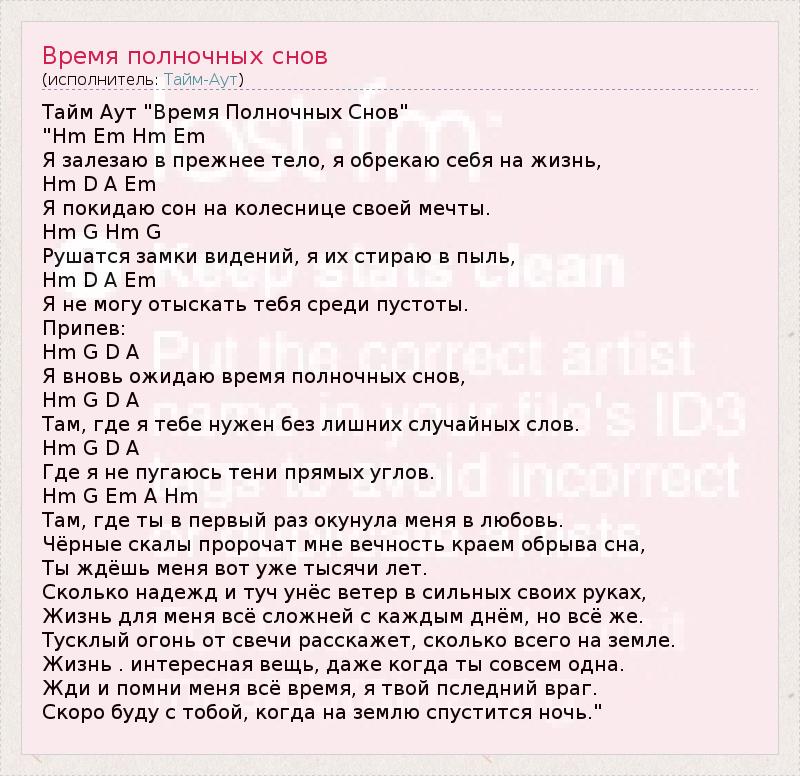 Тайм Аут "Время Полночных Снов" "Hm Em Hm Em Я залезаю в прежнее тело, я обрекаю себя на жизнь, Hm D A Em Я покидаю сон на колеснице своей мечты. Hm G Hm G Рушатся замки видений, я их стираю в пыль, Hm D A Em Я не могу отыскать тебя среди пустоты. Припев: Hm G D A Я вновь ожидаю время полночных снов, Hm G D A Там, где я тебе нужен без лишних случайных слов. Hm G D A Где я не пугаюсь тени прямых углов. Hm G Em A Hm Там, где ты в первый раз окунула меня в любовь. Чёрные скалы пророчат мне вечность краем обрыва сна, Ты ждёшь меня вот уже тысячи лет. Сколько надежд и туч унёс ветер в сильных своих руках, Жизнь для меня всё сложней с каждым днём, но всё же. Тусклый огонь от свечи расскажет, сколько всего на земле. Жизнь . интересная вещь, даже когда ты совсем одна. Жди и помни меня всё время, я твой пследний враг. Скоро буду с тобой, когда на землю спустится ночь."