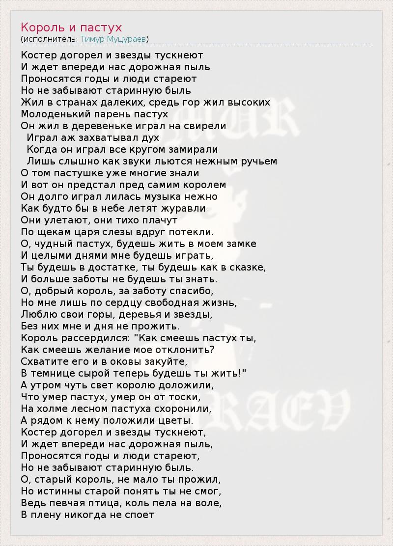 Костер догорел и звезды тускнеют И ждет впереди нас дорожная пыль Проносятся годы и люди стареют Но не забывают старинную быль Жил в странах далеких, средь гор жил высоких Молоденький парень пастух Он жил в деревеньке играл на свирели Играл аж захватывал дух Когда он играл все кругом замирали Лишь слышно как звуки льются нежным ручьем О том пастушке уже многие знали И вот он предстал пред самим королем Он долго играл лилась музыка нежно Как будто бы в небе летят журавли Они улетают, они тихо плачут По щекам царя слезы вдруг потекли. О, чудный пастух, будешь жить в моем замке И целыми днями мне будешь играть, Ты будешь в достатке, ты будешь как в сказке, И больше заботы не будешь ты знать. О, добрый король, за заботу спасибо, Но мне лишь по сердцу свободная жизнь, Люблю свои горы, деревья и звезды, Без них мне и дня не прожить. Король рассердился: "Как смеешь пастух ты, Как смеешь желание мое отклонить? Схватите его и в оковы закуйте, В темнице сырой теперь будешь ты жить!" А утром чуть свет королю доложили, Что умер пастух, умер он от тоски, На холме лесном пастуха схоронили, А рядом к нему положили цветы. Костер догорел и звезды тускнеют, И ждет впереди нас дорожная пыль, Проносятся годы и люди стареют, Но не забывают старинную быль. О, старый король, не мало ты прожил, Но истинны старой понять ты не смог, Ведь певчая птица, коль пела на воле, В плену никогда не споет