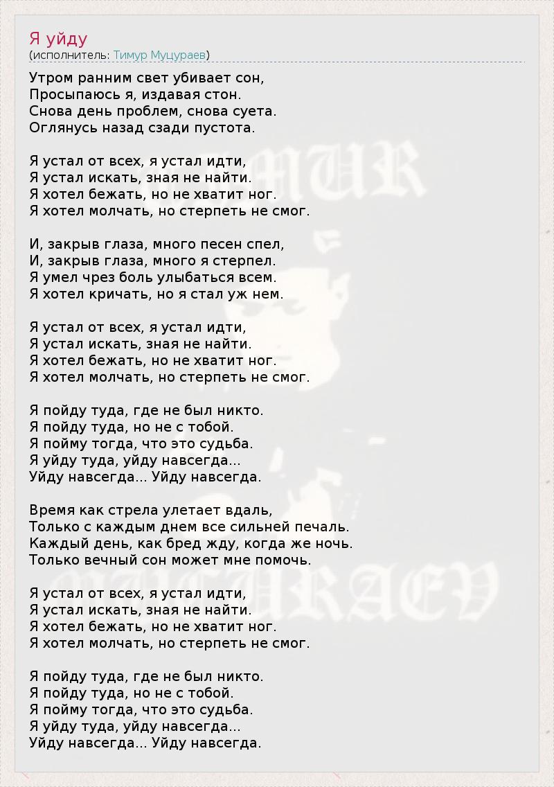Утром ранним свет убивает сон, Просыпаюсь я, издавая стон. Снова день проблем, снова суета. Оглянусь назад сзади пустота. Я устал от всех, я устал идти, Я устал искать, зная не найти. Я хотел бежать, но не хватит ног. Я хотел молчать, но стерпеть не смог. И, закрыв глаза, много песен спел, И, закрыв глаза, много я стерпел. Я умел чрез боль улыбаться всем. Я хотел кричать, но я стал уж нем. Я устал от всех, я устал идти, Я устал искать, зная не найти. Я хотел бежать, но не хватит ног. Я хотел молчать, но стерпеть не смог. Я пойду туда, где не был никто. Я пойду туда, но не с тобой. Я пойму тогда, что это судьба. Я уйду туда, уйду навсегда... Уйду навсегда... Уйду навсегда. Время как стрела улетает вдаль, Только с каждым днем все сильней печаль. Каждый день, как бред жду, когда же ночь. Только вечный сон может мне помочь. Я устал от всех, я устал идти, Я устал искать, зная не найти. Я хотел бежать, но не хватит ног. Я хотел молчать, но стерпеть не смог. Я пойду туда, где не был никто. Я пойду туда, но не с тобой. Я пойму тогда, что это судьба. Я уйду туда, уйду навсегда... Уйду навсегда... Уйду навсегда.