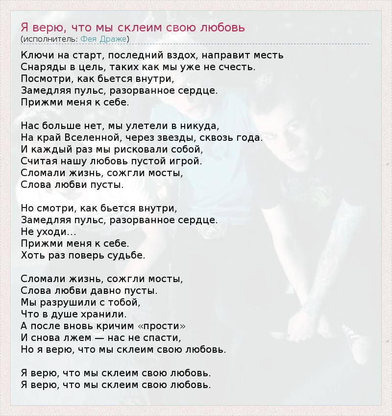 ГлавнаяИсполнителиФея ДражеЯ верю, что мы склеим свою любовь
