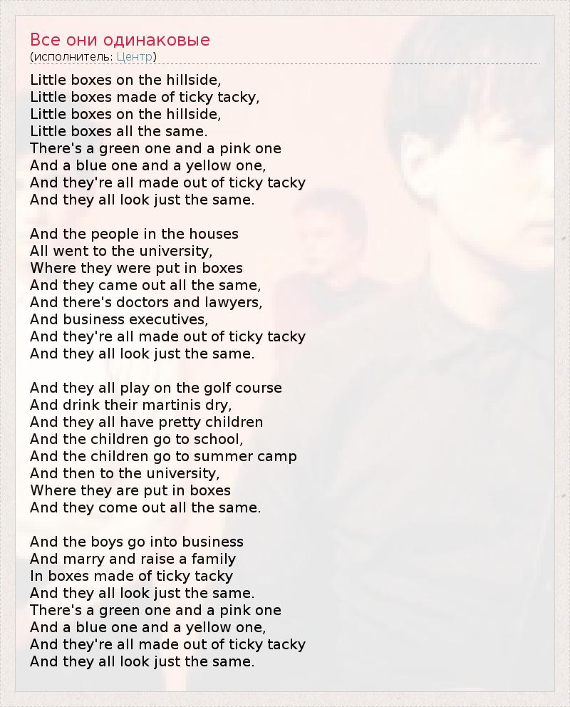 Маленькие дома-коробочки на склоне холма, Маленькие дома-коробочки, построенные из дешевого, непрочного материала. Маленькие дома-коробочки на склоне холма, Маленькие дома-коробочки все одинаковые. Есть зеленый домик и розовый, Синий и желтый, И все они построены из дешевого, непрочного материала, И все они выглядят совсем одинаково. И люди, живущие в домиках, Все ходили в университет, Где их помещали в классы-коробки, И они вышли оттуда все одинаковые, И среди них доктора и юристы, И руководящие работники, И все они сделаны из дешевого материала, И все они выглядят совсем одинаково. И все они играют на поле для гольфа И пьют свой сухой "Мартини". И у всех них замечательные дети. И дети ходят в школу, И дети ездят в летний лагерь, А затем ходят в университет, Где их помещают в классы-коробки, И они выходят оттуда все одинаковые. И мальчики идут в бизнес И женятся, и растят детей В домах-коробочках из дешевого, непрочного материала, И все они выглядят совсем одинаково. Есть зеленый домик и розовый, Синий и желтый, И все они построены из дешевого, непрочного материала, И все они выглядят совсем одинаково. 1 - кавер-версия песни, написанной Мальвиной Рейнольдс в 1962 году и исполненная Питом Сигером в 1963 году. Эта песня - политическая сатира развивающегося пригорода и конформистских взглядов среднего класса. Она о застройке однотипными домами - разноцветными "маленькими коробками" из дешевого, непрочного материала, которые выглядят одинаково.