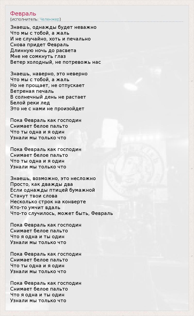 Знаешь, однажды будет неважно Что мы с тобой, а жаль И не случайно, хоть и печально Снова придет Февраль Длинную ночь до расвета Мне не сомкнуть глаз Ветер холодный, не потревожь нас Знаешь, наверно, это неверно Что мы с тобой, а жаль Но не прощает, не отпускает Ветреная печаль В солнечный день не растает Белой реки лед Это не с нами не произойдет Пока Февраль как господин Снимает белое пальто Что ты одна и я один Узнали мы только что Пока Февраль как господин Снимает белое пальто Что ты одна и я один Узнали мы только что Знаешь, возможно, это несложно Просто, как дважды два Если однажды птицей бумажной Станут твои слова Несколько строк на конверте Кто-то умчит вдаль Что-то случилось, может быть, Февраль Пока Февраль как господин Снимает белое пальто Что я одна и ты один Узнали мы только что Пока Февраль как господин Снимает белое пальто Что ты одна и я один Узнали мы только что Пока Февраль как господин Снимает белое пальто Что я одна и ты один Узнали мы только что