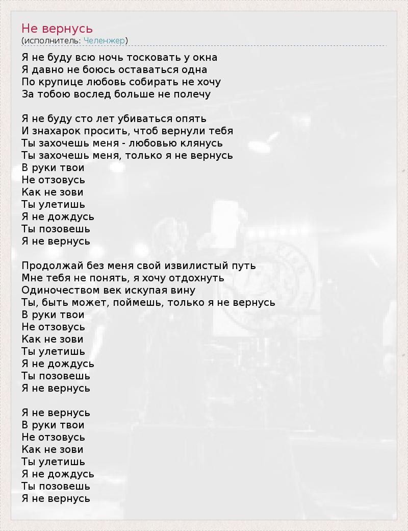 Я не буду всю ночь тосковать у окна Я давно не боюсь оставаться одна По крупице любовь собирать не хочу За тобою вослед больше не полечу Я не буду сто лет убиваться опять И знахарок просить, чтоб вернули тебя Ты захочешь меня - любовью клянусь Ты захочешь меня, только я не вернусь В руки твои Не отзовусь Как не зови Ты улетишь Я не дождусь Ты позовешь Я не вернусь Продолжай без меня свой извилистый путь Мне тебя не понять, я хочу отдохнуть Одиночеством век искупая вину Ты, быть может, поймешь, только я не вернусь В руки твои Не отзовусь Как не зови Ты улетишь Я не дождусь Ты позовешь Я не вернусь Я не вернусь В руки твои Не отзовусь Как не зови Ты улетишь Я не дождусь Ты позовешь Я не вернусь
